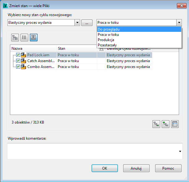 Aby zmienić stan cyklu rozwojowego pliku, wybierz menu rozwijane stanu cyklu rozwojowego i wybierz odpowiedni stan. Lista rozwijana stanu cyklu rozwojowego dla poszczególnych plików zawiera wszystkie dostępne stany w danej definicji cyklu rozwojowego (dla której przejścia z bieżącego stanu do stanu na liście są dozwolone).