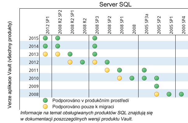 W poniższej tabeli podsumowano zgodne wydania programów Vault i SQL ciemnymi niebieskimi kropkami. Jasnoszare kropki są zalecaną ścieżką uaktualnienia. Należy zapoznać się z dokumentacją programu Vault, dostępną online, aby zapewnić zgodność między wydaniami produktów Vault i SQL.