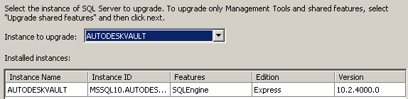 - Sprawdź wersję i/lub klucz produktu pełnej wersji programu SQL 2008, przejdź do okna Select Instance (Wybierz wystąpienie) i wybierz wystąpienie AutodeskVault.
