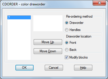 | Handles (Obsolete) | Organiza a ordem de desenho dos objetos selecionados reordenando os objetos no banco de dados de desenhos. Os objetos são excluídos e recriados na ordem definida por sua cor. |