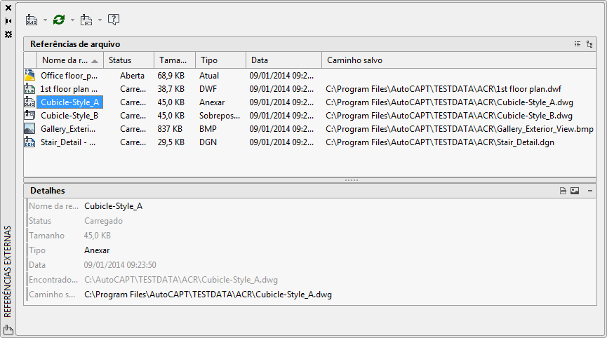- Exibe uma lista de referências no desenho atual, incluindo informações como o status, o tamanho e a data de criação.