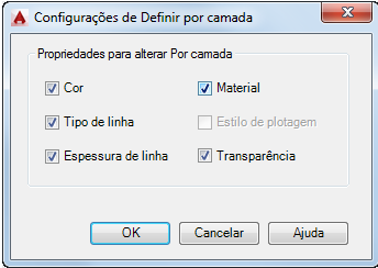 Altera as sobreposições de propriedades para cor, tipo de linha, espessura de linha, material, estilo de plotagem e transparência para PorCamada para objetos selecionados e blocos inseridos em camadas desbloqueadas.