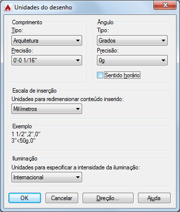 Os valores incluem Architectural, Decimal, Engineering, Fractional e Scientific. Os formatos Engineering e Architectural produzem exibições em pés e polegadas e assumem que cada unidade de desenho representa uma polegada. Os outros formatos podem representar qualquer unidade real.