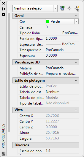 Se nenhum objeto estiver selecionado, as listas suspensas realçadas acima exibirão as configurações atuais para o desenho. Se você selecionar um objeto, as listas suspensas exibirão as configurações de propriedades do objeto.
