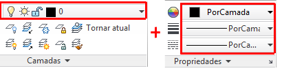 Na guia Início da faixa de opções, utilize as camadas e painéis de propriedades para verificar ou alterar as configurações para as propriedades mais comumente acessadas: camada, cor, espessura de linha e tipo de linha.