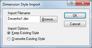 | Import Options | Inclui o Manter estilo existente, para manter o estilo de cota no desenho atual e o Substituir estilo existente para substituir os estilos no desenho atual. A opção Manter o estilo existente ignora o estilo de nome semelhante que está sendo importado; Substituir estilo existente usa o estilo de nome semelhante que está sendo importado.o existente utiliza o estilo da mesma forma que está sendo importado. |