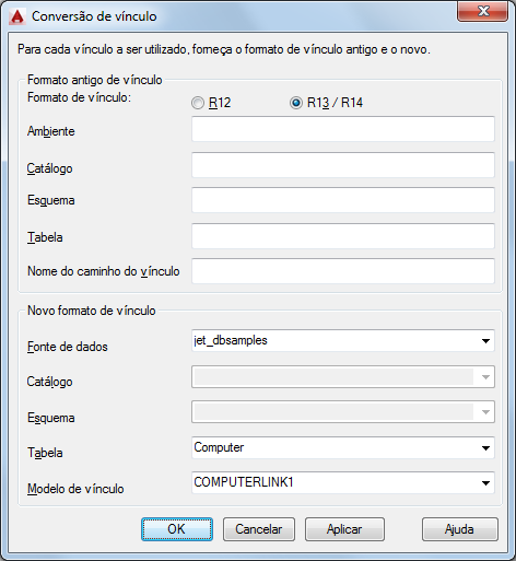 Em Tabela, insira o nome da tabela do banco de dados do Versão 13 ou Versão 14 para o vínculo que deseja converter.