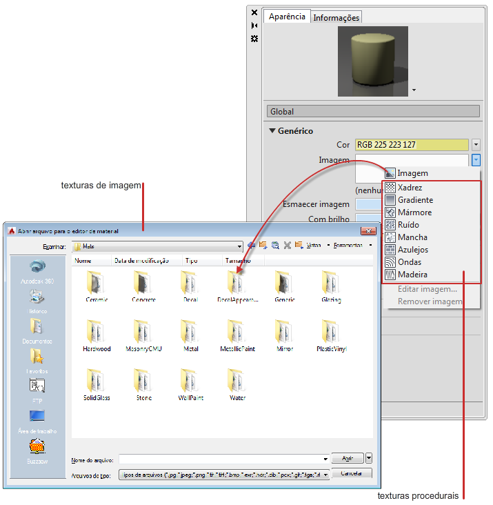 O produto fornece uma biblioteca de imagens que é possível utilizar com texturas. Você também pode adicionar suas próprias texturas com os seguintes tipos de arquivos: