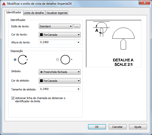 - Quando selecionado, conecta o limite de detalhe ao identificador com uma linha de chamada, quando o identificador é movido para fora de sua posição padrão.