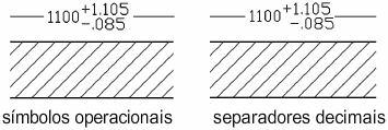Juntamente com o posicionamento vertical dos valores de tolerância, você também pode controlar o alinhamento horizontal dos valores de tolerância superior e inferior. Os valores de tolerância superior e inferior podem ser alinhados com os símbolos operacionais ou com os separadores decimais.