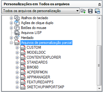 O painel Personalizações em é usado para navegar pelos diferentes elementos da interface do usuário que estão nos arquivos de personalização carregados.