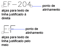 Os objetos de texto também possuem alças para movimentação, redimensionamento e rotação. Um objeto texto tem alças no canto inferior esquerdo e no ponto de alinhamento.