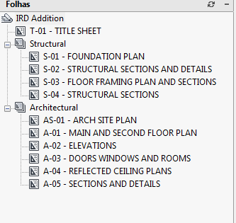 • Os subconjuntos de folhasestão sempre associados com uma disciplina, como arquitetura ou projeto mecânico. Em arquitetura, você pode usar um subconjunto chamado Estrutural. Em desenho mecânico, você pode usar um subconjunto chamado Prendedores padrão. Em alguns casos, pode ser útil criar subconjuntos associados a um status de conclusão ou análise. Você pode aninhar subconjuntos em outros subconjuntos como necessário. Após você criar ou importar folhas ou subconjuntos, poderá reordená-los ao arrastá-los na vista em árvore.