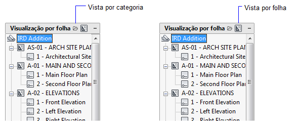 • As categorias de visualização estão sempre associadas a uma função. Em arquitetura, é possível usar uma categoria da vista chamada Elevações. Em desenho mecânico, pode-se usar uma categoria da vista chamada Explodido. Você pode exibir visualizações por categorias ou pela folha em que elas estão localizadas. Você pode aninhar categorias em outras categorias como necessário. Para mover uma vista para uma outra categoria, arraste-a na vista em árvore ou use a opção de menu de atalho Categoria de conjunto.