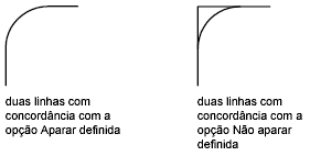 Para efetuar a concordância de linhas com polilinhas, cada linha ou sua extensão precisa estar na interseção de um dos segmentos de linha de polilinhas. Se a opção Aparar está ativada, os objetos e arcos dos quais foram feitas concordâncias encontram-se para formar uma nova e única polilinha.