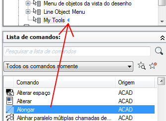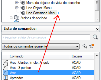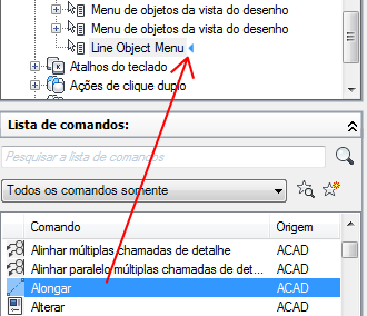 6. No painel Lista de comandos, arraste o comando que deseja adicionar ao menu de atalho no painel Personalizações em <nome do arquivo>.