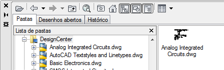- Histórico. Exibe uma lista dos arquivos anteriormente abertos com o DesignCenter. Clique duas vezes em um arquivo de desenho na lista para navegar até ele na vista em árvore da guia Pastas e carregar o conteúdo na área de conteúdo.