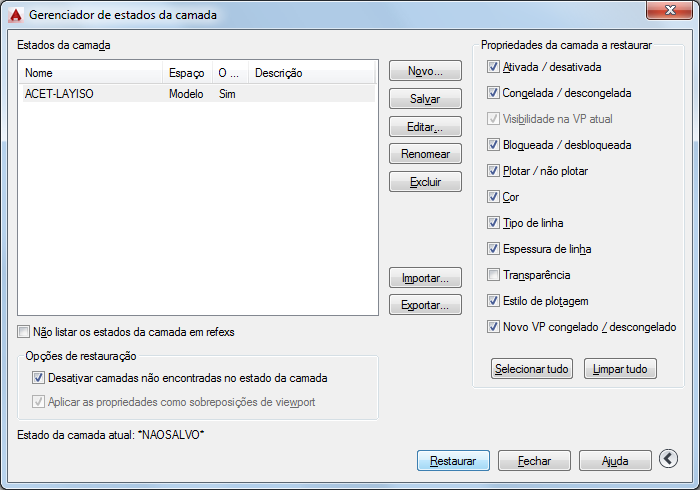 Quando um estado de camada é restaurado, ele desativa novas camadas para as quais as configurações não foram salvas, para que o desenho seja parecido com o que era quando o estado de camada foi salvo.