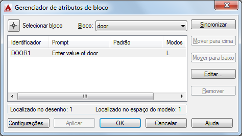 Os atributos do bloco selecionado são exibidos na lista de atributos. Por padrão, as propriedades de atributos Identificador, Prompt, Padrão, Modo e Anotativo, são exibidas na lista de atributos. Será fornecido para cada bloco selecionado uma descrição abaixo da lista de atributos que identifica o número de suas ocorrências no desenho e no layout atuais.