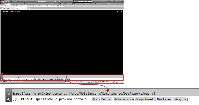 A janela de comandos encaixada tem a mesma largura da janela do aplicativo. Ela é exibida em uma posição fixa acima ou abaixo da área de desenho.
