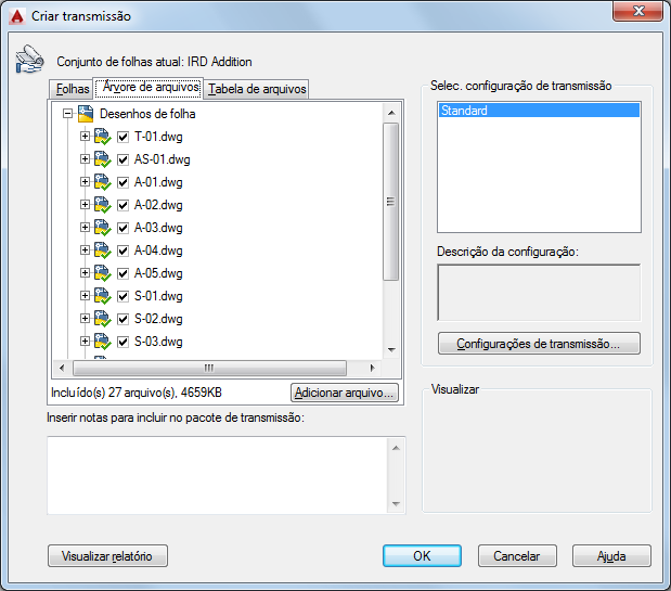 Por padrão, todos os arquivos associados ao desenho atual (como refex, estilos de plotagem e fontes relacionados) são apresentados. Você pode adicionar arquivos ao pacote de transmissão ou remover arquivos existentes. Os arquivos relacionados que são mencionados pelos URLs não são incluídos no pacote de transmissão.