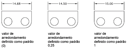 Você pode arredondar todos os valores de cota, exceto os valores das cotas angulares. Por exemplo, se você especificar um valor de arredondamento de 0.25, todas as distâncias serão arredondadas para a unidade mais próxima de 0.25. O número de dígitos exibidos depois da vírgula decimal depende da precisão definida para as unidades primária e alternativa e para os valores de tolerância lateral.