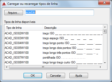 Exibe o nome do arquivo LIN atual. Você pode inserir o nome de outro arquivo LIN ou escolher File para selecionar um outro arquivo na caixa de diálogo Select Linetype File.