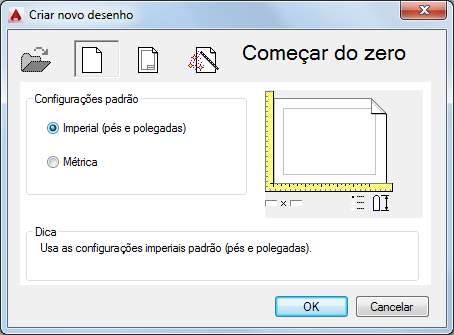 Start from Scratch cria um novo desenho com as configurações padrão imperial ou métrica. Use a Template cria um novo desenho com as configurações definidas em um modelo de desenho selecionado. Use a Wizard cria um novo desenho com as configurações especificadas no assistente Quick ou Advanced. (A primeira opção, Abrir um desenho, não fica disponível a partir do comando NOVO. Para abrir um desenho existente, utilize ABRIR.)
