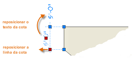 Neste exemplo, selecione a cota para exibir suas alças. A seguir, clique na alça no texto de cota e arraste-a para um novo local; ou você pode clicar em uma das alças na extremidade da linha de cota e arrastar a linha de cota.