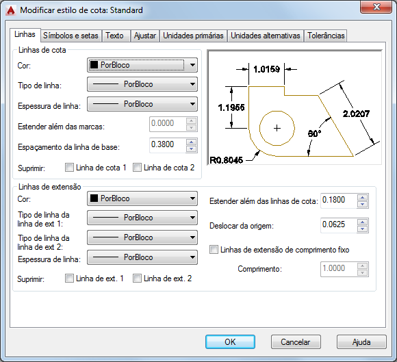 Estilos de cota ajudam a definir e aplicar os desenhos padrão. Há muitas variáveis de cota que podem ser definidas com o comando ESTILOCOTA para controlar quase todas as nuances de aparência e de comportamento das cotas. Todas as configurações são armazenadas em cada estilo de cota.