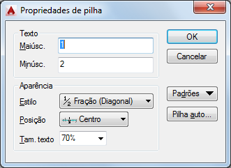 Exibe a caixa de diálogo Propriedades de pilha automática. AutoStack empilha somente caracteres numéricos imediatamente anteriores e posteriores aos caracteres acento circunflexo, barra e cerquilha. Para empilhar caracteres não numéricos ou texto que inclui espaços, selecione o texto e selecione Empilhar no menu de atalho do editor de texto.