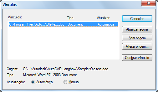 Rompe o vínculo entre o objeto e o arquivo original. O objeto no desenho é alterado para WMF (Formato de meta-arquivo do Windows), que não será afetado por alterações futuras no arquivo original.