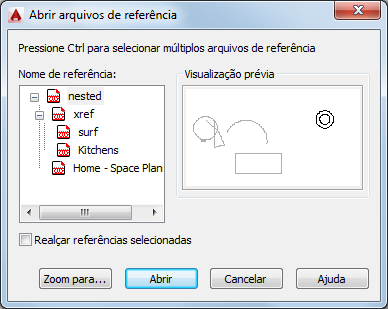 Fecha temporariamente a caixa de diálogo Abrir arquivos de referência e aproxima o zoom na vista na área de desenho para a referência selecionada. Pressione Enter para reexibir a caixa de diálogo.