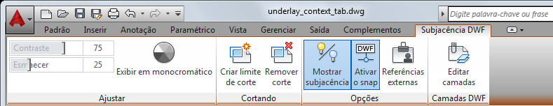 Quando você seleciona uma subjacência DWF em um desenho, a guia contextual Subjacência DWF é exibida na faixa de opções.