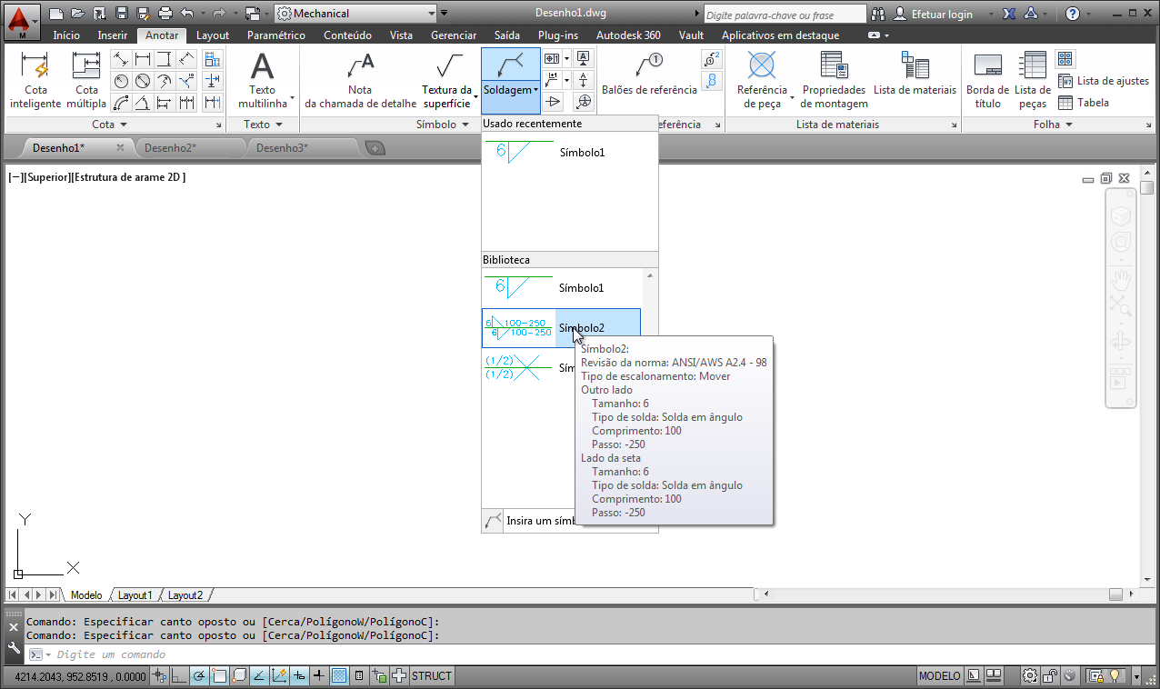Na maioria dos casos, é possível inserir símbolos da biblioteca de símbolos diretamente a partir da faixa de opções. Como esses símbolos estão totalmente configurados, o AutoCAD Mechanical não exibe uma caixa de diálogo ao incluí-los no desenho. Você pode obter uma economia significativa de tempo com esta operação ao inserir símbolos de uso frequente.