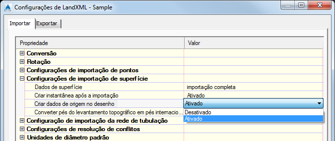 Figura 2: Configurações de importação de superfície do LandXML