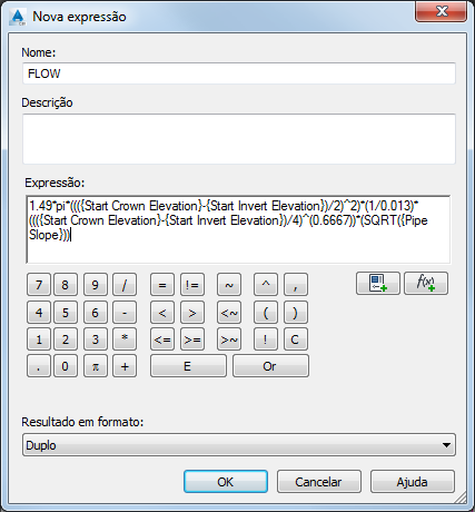 Esta expressão assume um valor de Manning “n” de 0.013, que é o padrão para a tubulação de concreto. Na verdade, tubulações têm um componente nomeado para o valor de Manning “n”, que pode ser definido. No entanto, a adição deste componente para a expressão produz um resultados indesejados, assim, não se deve utilizá-lo para este procedimento.