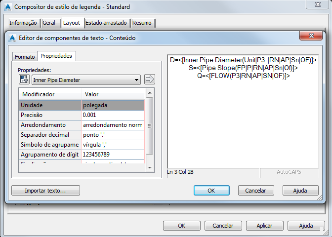 A próxima etapa é para criar um estilo de legenda de tubulação para planta e perfil que exibe este valor para fluxo. A Figura 12 mostra um exemplo deste estilo de legenda com todas as configurações hidráulicas pertinentes: