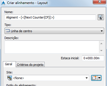 Quando você criar um alinhamento com as caixas de diálogo Criar alinhamento - Layout ou Criar alinhamento - pela polilinha, o padrão será criar o alinhamento com nenhum terreno especificado <Nenhum>, conforme mostrado na imagem 2.