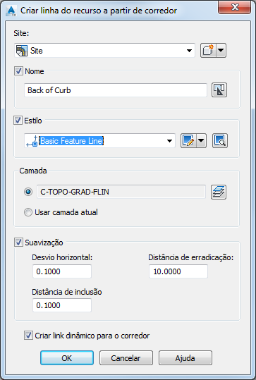 Uma melhor prática é selecionar a opção Vínculo dinâmico na caixa de diálogo Criar linha do recurso a partir do corredor, conforme mostrado na imagem 35, de modo que, neste exemplo, qualquer atualização ao corredor irá atualizar o nivelamento nesta área também. Além disso, há configurações para suavização no intuito de manusear a formação da linha do recurso quando esta percorrer em torno de uma área curvada. Para obter mais informações, consulte Suavização de linha do recurso.