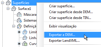 O AutoCAD Civil 3D permite exportar arquivos DEM de uma superfície. Durante a exportação, é possível expandir o espaçamento da malha para criar o arquivo menor. A Figura 3 mostra a seleção do menu usado para iniciar o processo de exportação.