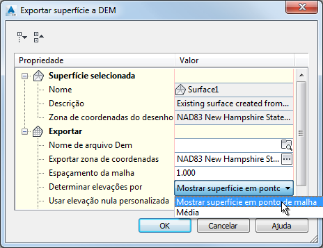 Uma configuração de exportação importante é o método para determinar a elevação em cada ponto. Você pode escolher experimentar a elevação da superfície no ponto da malha ou calcular a elevação média a partir dos pontos ao redor. O último método (média) é mais demorado. Para maior eficiência, utilize a opção de amostragem de superfície, como exibido na figura 4.