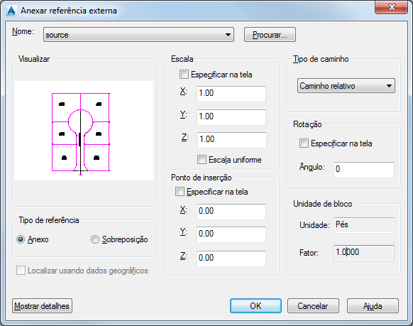 - Na caixa de diálogo Referência externa, defina o Ponto de inserção para 0,0,0, a escala para 1,1,1 e o ângulo de rotação para 0.