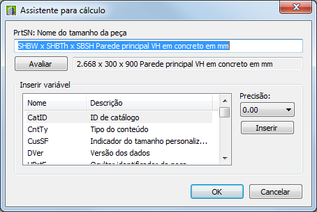 As sequências de cálculo associadas com os valores do parâmetro são exibidas. Por exemplo, a fórmula de cálculo para um Nome de tamanho de peça (PrtSN) para uma estrutura deveria ser “SHBW x SHBTh x SBSH polegadas da Parede de Retenção de Concreto”. Ou para uma tubulação, poderia ser FormatNumber($PID,0) + “ polegadas de Tubulação de Concreto”.