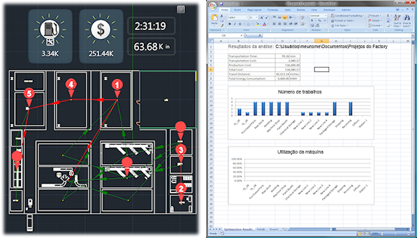 É possível analisar os layouts de fábrica para custos de transporte e utilização da máquina. Em seguida, modifique o layout e analise novamente para otimizar o layout de fábrica.