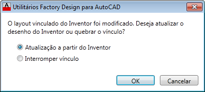 A caixa de diálogo é exibida ao abrir um desenho 2D do AutoCAD cujo layout vinculado do Inventor Factory foi revisado. Clique em OK para atualizar o desenho com as alterações do layout 3D.