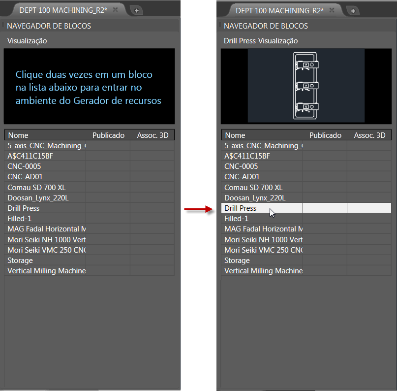 Clique duas vezes no bloco que você deseja converter em um recurso e publicar. Assim, você entra no ambiente do Gerador de recursos e o bloco selecionado aparece na janela de visualização do Navegador de blocos, como mostrado na imagem acima. O bloco também é realçado na janela de desenho.