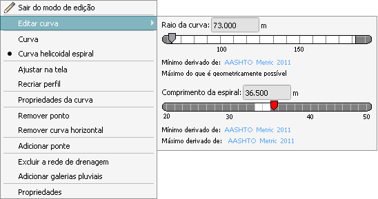 O valor de comprimento da espiral é aplicado às espirais antes e após a curva.