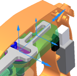 - No navegador, em Juntas padrão, selecione a junta Prismático (Guia:1, Jugo escocês:1). Quando a velocidade nas estruturas de referência é positiva, as estruturas apontam para fora da extremidade da lâmina. Se as estruturas de referência apontam para a lâmina da serra, é possível editar a junta e alterar ou reverter a direção.
