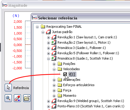 - Na caixa de diálogo Selecionar referência, expanda Juntas padrão > Prismático (Guia:1, Jugo escocês:1) para visualizar a pasta de velocidades e o conteúdo. Clique V(1) para especificar a velocidade como variável no eixo X do gráfico.